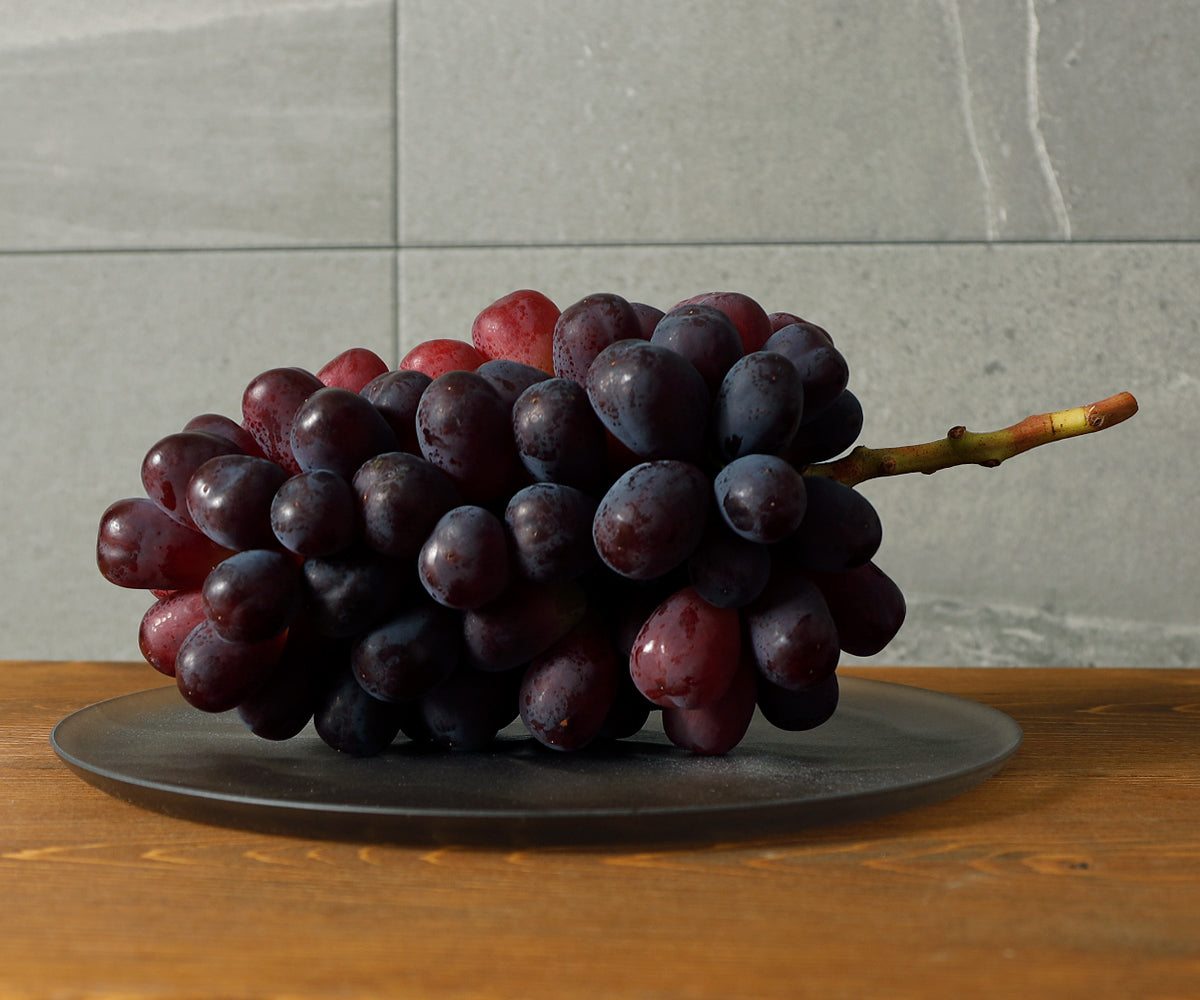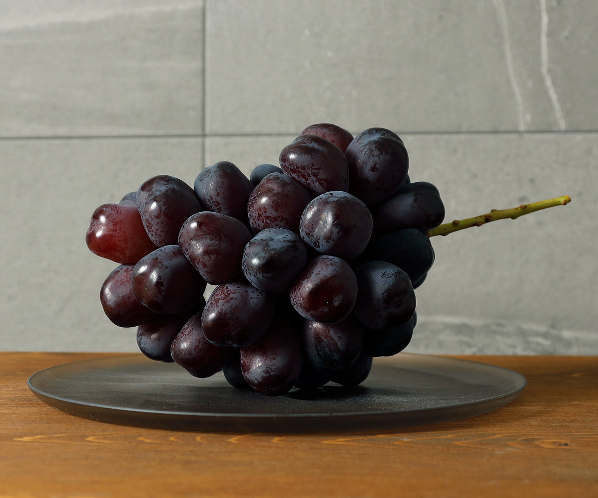 ウインクの房はかなり大きな有岐円錐状になり、栽培過程で整形されます。果梗がやや太く果粒としっかり付いていて脱粒しにくく、日持も良いです。 果粒は大粒の長楕円形で果皮の色は青黒から紫黒色をしており、表面は薄く果粉に覆われています。この表面を軽く拭き上げるとまるで作り物の葡萄のような見事な艶が現れま